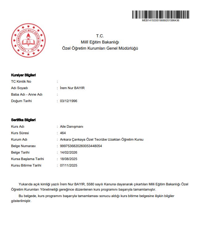 Doğu Akdeniz Üniversitesi Psikoloji bölümü mezunu, genel psikoloji alanında yüksek lisans sürecine devam eden ve aynı zamanda Milli Eğitim Bakanlığı onaylı Aile Danışmanlığı eğitimini tamamlamış bir psikoloğum.